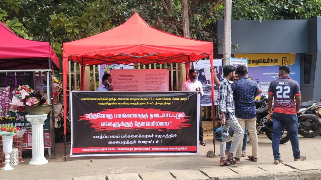 எந்தவொரு பயங்கரவாதத் தடைச்சட்டமும் எங்களுக்குத் தேவையில்லை எனவும்,அதை அரசு உடனடியாக இரத்துச் செய்யவேண்டும் எனவும் வலியுறுத்தி யாழ்ப்பாணப் பல்கலைக்கழகச் சமூகத்தினர் கையெழுத்துப் போராட்டத்தில் இன்று (19) ஈடுபட்டுள்ளனர்.